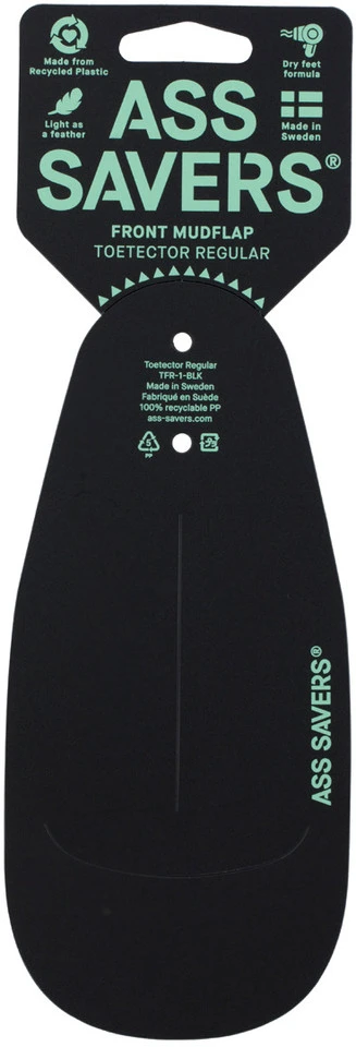 Die ToeTector Regular Schutzblechverlängerung von ASS SAVERS lässt sich per Kabelbinder an einem montierten Vorderrad-Schutzblech befestigen und schützt dann Deine Zehen und Deinen Antrieb vor Spritzwasser.