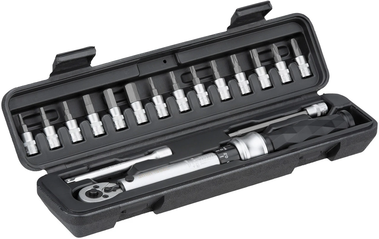 Das 3min19sec Drehmomentschlüssel-Set besteht aus einem Drehmomentschlüssel mit einem Einstellbereich von 1 bis 25 Nm sowie vielen verschiedenen Aufsätzen.