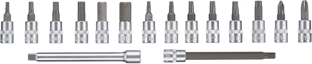 1 x Drehmomentschlüssel 3min19sec6 x Innensechskantaufsatz1 x Innensechskant-Aufsatz extralang6 x Torx-Aufsatz2 x Kreuzschlitz-Aufsatz2 x Steckschlüssel1 x Verlängerung1 x Aufbewahrungsbox