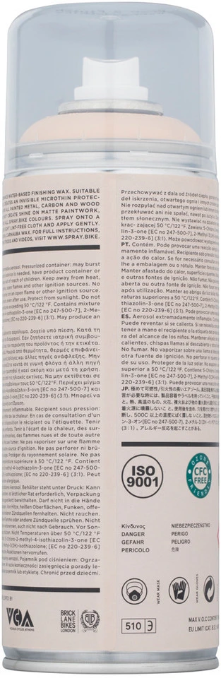 Die Frame Builders Top Wax Sprühpflege von Spray.Bike bildet eine schützende Schicht und erhält dabei den Matteffekt der Spray.Bike Sprühlacke. Du kannst Deinen Rahmen auch nach der Fahrradreinigung mit Top Wax behandeln. So bleibt der tolle Look Deines Rahmens lange erhalten. Die Sprühpflege eignet sich für lackierte Oberflächen auf Stahl, Aluminium, Carbon und sogar Holz.