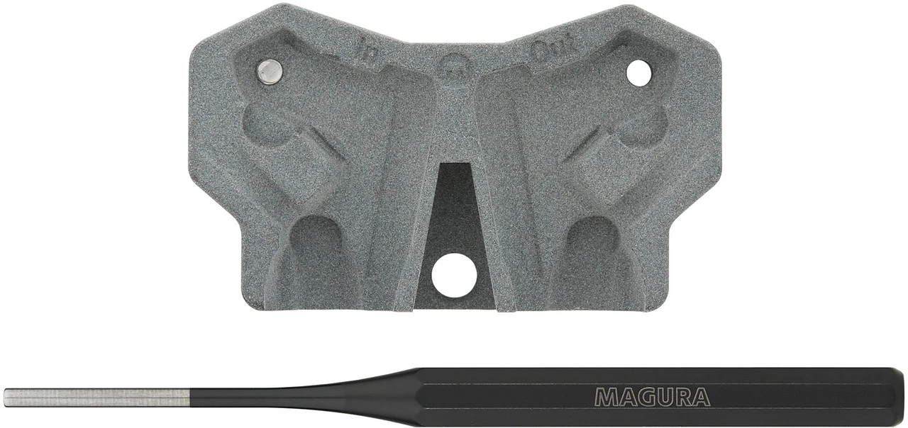 Das Hebeltauschwerkzeug von Magura mit Durchschlagwerkzeug dient dem Bremshebelwechsel