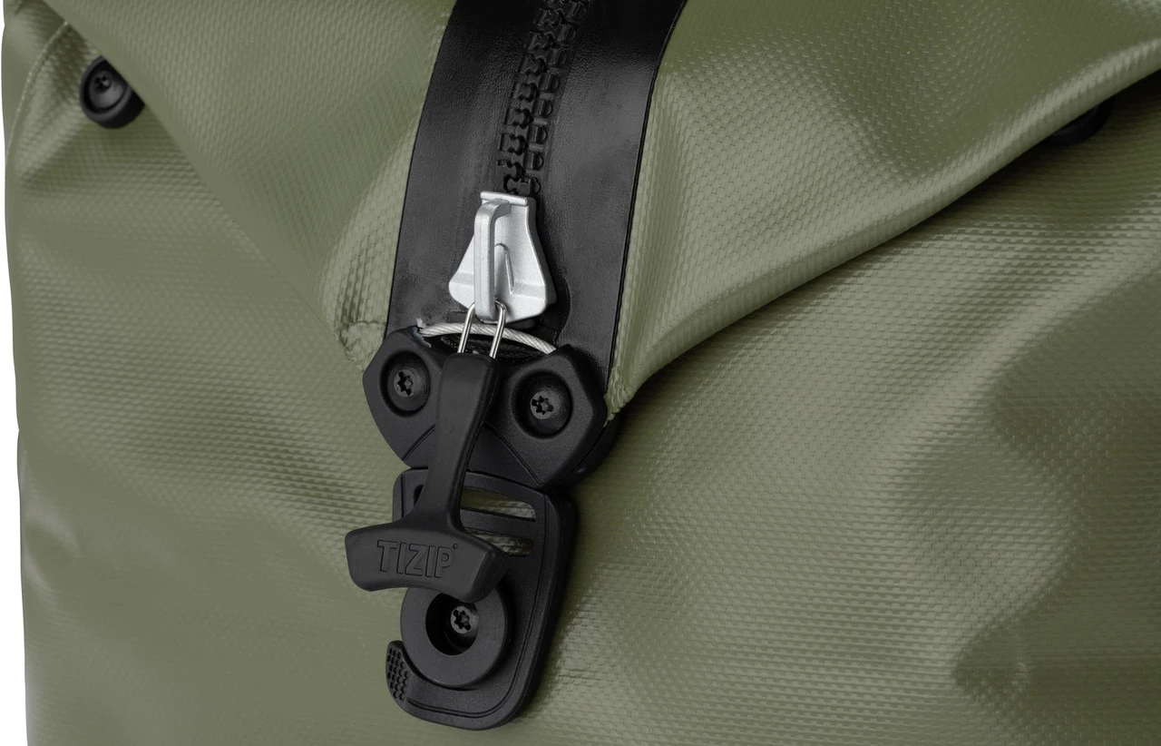 Der von ORTLIEB verwendete TIZIP-Reißverschluss besteht aus einem Kunststoffspiralreißverschluss auf einem stabilen Gewebe. Dichtende Reißverschlüsse “ gehen schwerer“ als konventionelle Reißverschlüsse und müssen deshalb regelmäßig mit Gleitpaste gangbar gehalten werden. Produkte mit TIZIP-Reißverschluss eignen sich überall dort, wo einerseits Schutz vor Nässe und Staub gewährleistet sein muss und andererseits ein schneller und bequemer Zugriff gefragt ist. Jede Spiralhälfte ist in einem Kunststoffprofil sicher eingebettet und fixiert. Beim Schließen des Reißverschlusses werden die oberhalb und unterhalb der Spirale liegenden Dichtlippen aneinandergedrückt. Die ausgeklügelte Konstruktion verhindert eine Reibung des Schiebers an den Dichtlippen sowohl beim Öffnen als auch beim Schließen. Im Übrigen ist das Kunststoffprofil hochabriebfest. Die Physik des Reißverschlusses ist so ausgelegt, dass sich die Dichtigkeit bei einer Erhöhung des Innendruckes oder generell bei einer Querbelastung dadurch verbessert, dass die Dichtlippen stärker aneinandergepresst werden. Der Reißverschluss ist extrem unempfindlich gegen Schmutz und zeigt auch unter rauen Bedingungen bestes Stehvermögen und Langlebigkeit. Er ist trittfest, hoch abriebfest und verträgt auch kurzfristig eine scharfe Knickung. Der Reißverschluss hat eine extrem hohe Querzugfestigkeit von 300 N/cm in geschlossenem Zustand.