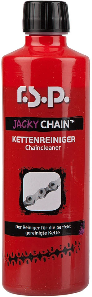 Features:r.s.p. Kettenreiniger und -reinigungsgerät im Setlöst selbst Öle, Fette und lästige Verharzungenbildet dünnen Film als Korrosionsschutzoptimale Vorbereitung vor dem Schmieren der KetteAnwendung:Fülle Dein r.s.p. Kettenreinigungsgerät bis zur Markierung mit Jacky Chain. Halte das Reinigungsgerät von unten an die montierte Kette und verschließe jetzt das Oberteil. Den Bügel links an die Schaltung hängen. Drehe jetzt die Kurbel langsam rückwärts und erlebe Jacky Chain beim Reinigen deiner Kette. Bei einer besonders stark verschmutzten Kette Jacky Chain nach ein paar Umdrehungen austauschen.