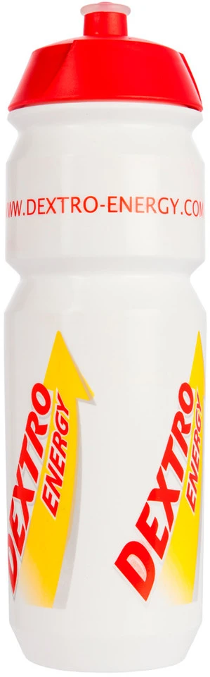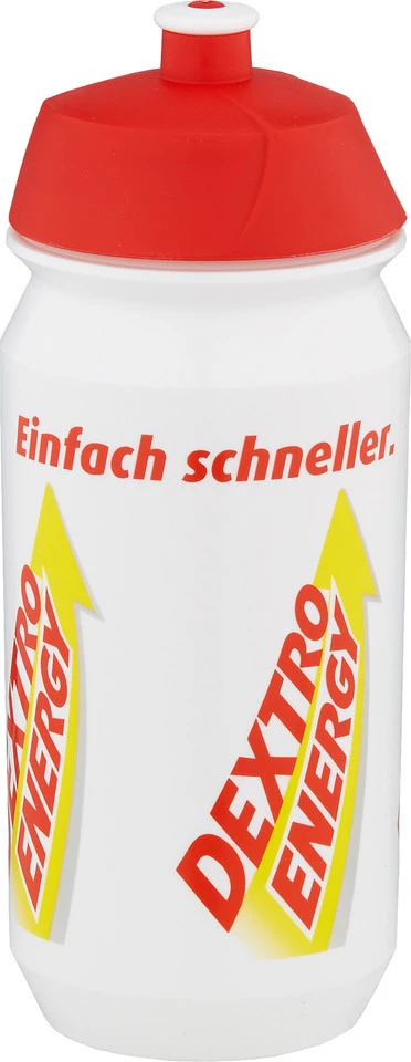 PET Trinkflasche im Dextro Energy Design (gelb-rot auf weißem Grund).